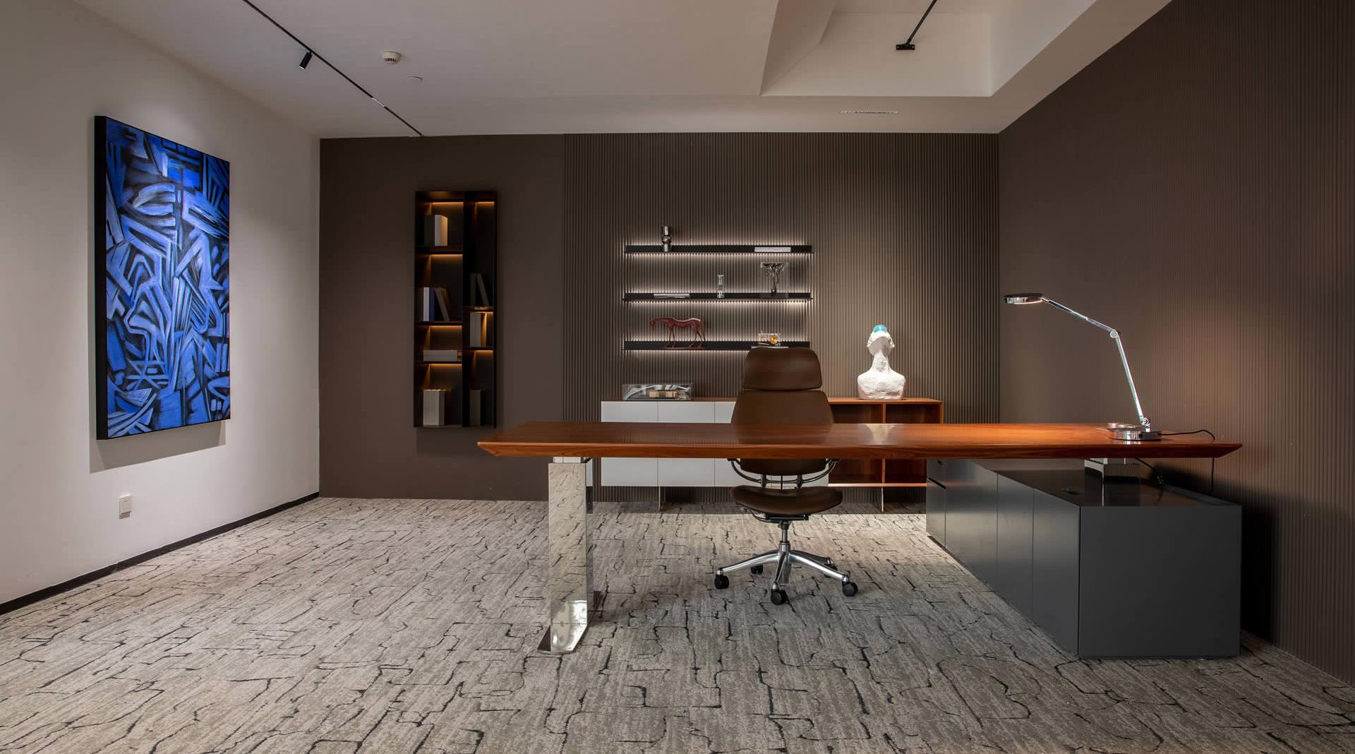 The collision and integration of two materials create an office workspace that is both professional and efficient, yet full of style.