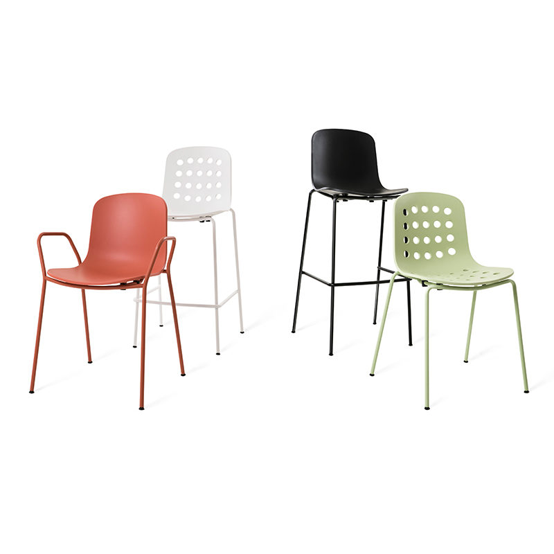 The collection offers a wide range of sitting solutions, with or without armrests, and two different heights for the stools, which are all stackable.