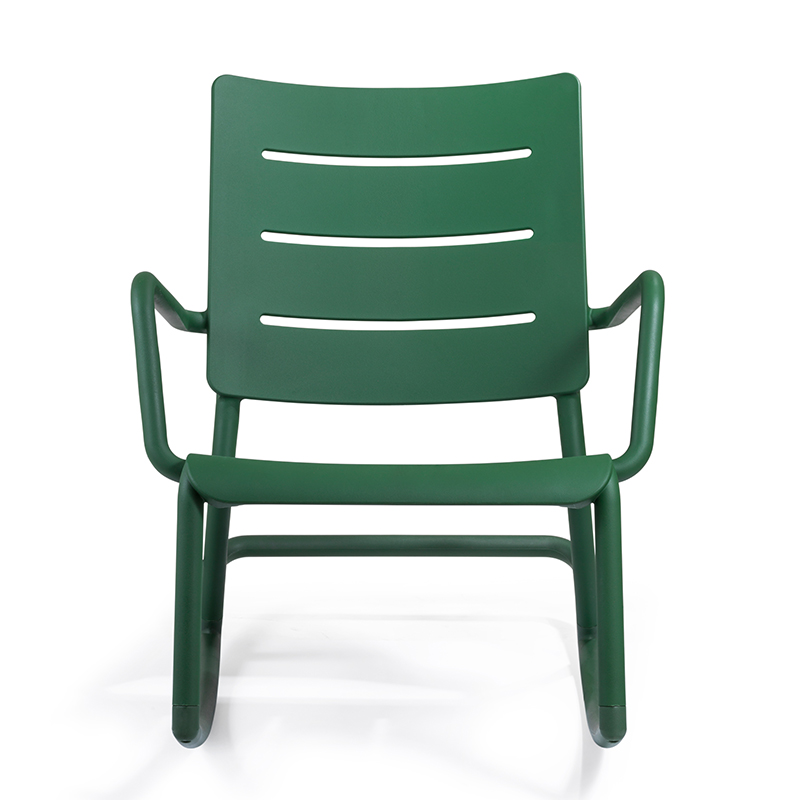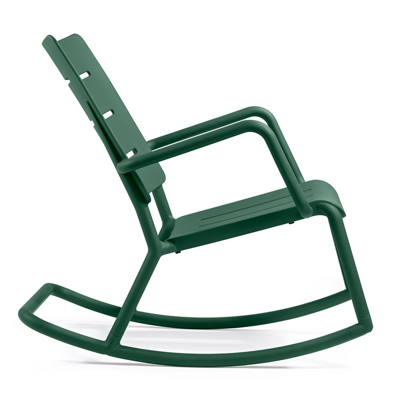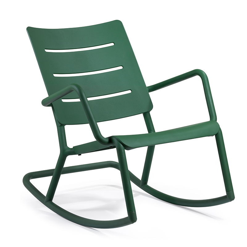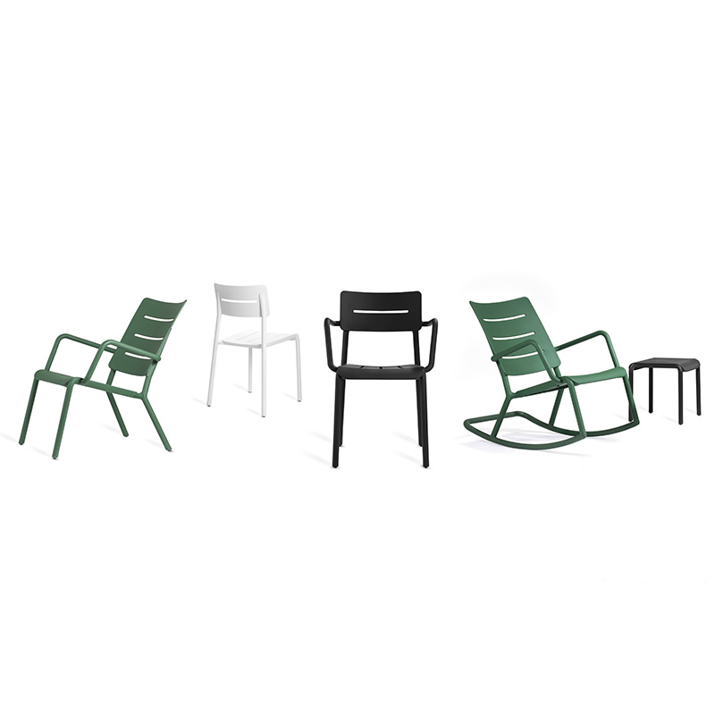 The diverse pieces that together form the Outo family, provide solutions that actually suit both outdoor and indoor contexts. Armchairs and side chairs will blend with each other or with any table. Offered with complementary accessories such as the connector table, that makes it possible to unite two or more armchairs in a row for an outdoor wedding, an indoor conference, or just as a bench. And the lounge and rocking chairs with sporting wide, comfortable backrests, which immediately conveys the idea of a leisurely afternoon in the garden or in front of your fireplace.